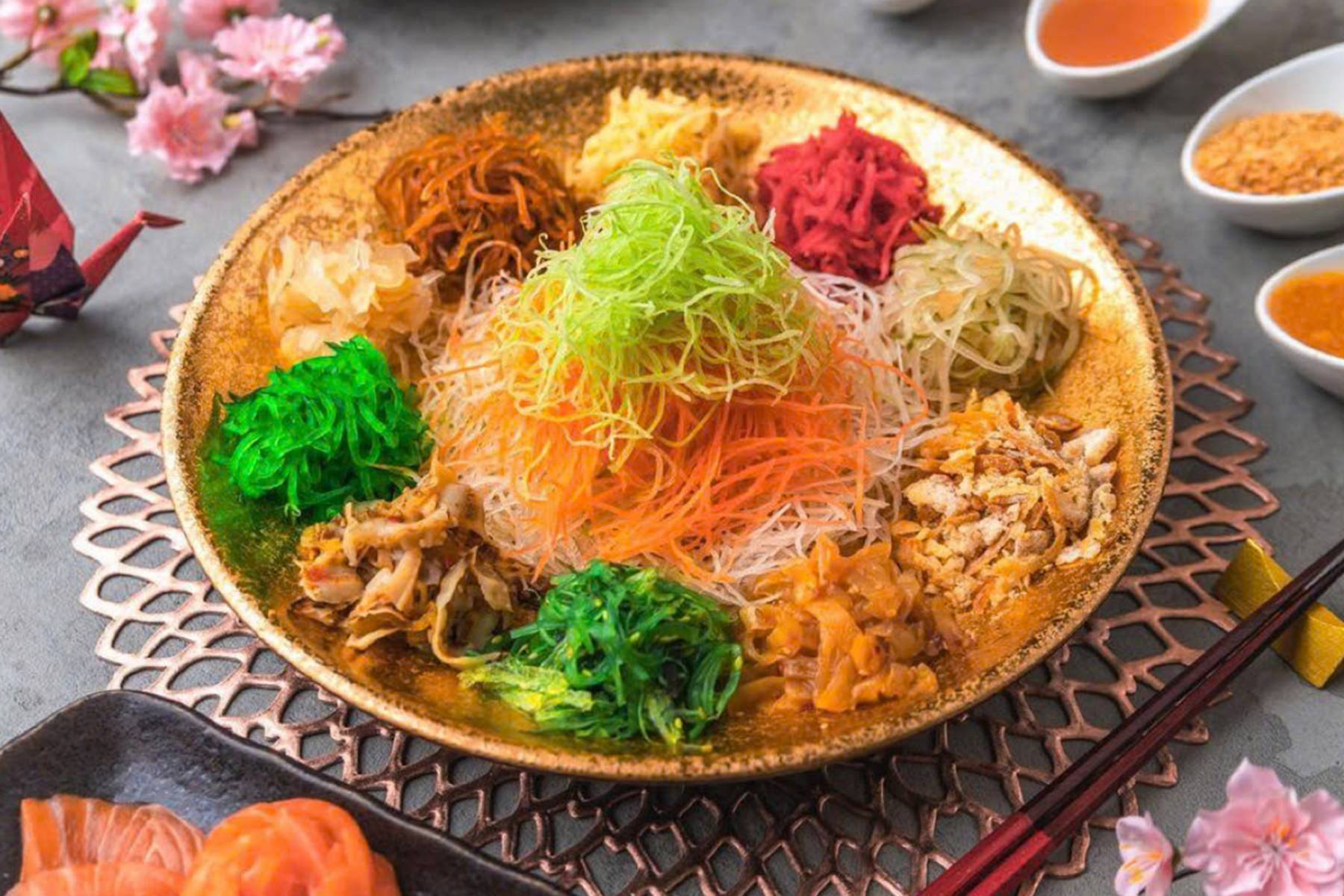 Xới càng cao, năm mới càng phát tài. Đón năm mới cùng 2 lựa chọn thực đơn Yusheng – Gỏi Phát Tài độc đáo, Gỏi Yee Sang với Cá Hồi Xông Khói và Gỏi Yee Sang với Sứa Biển.