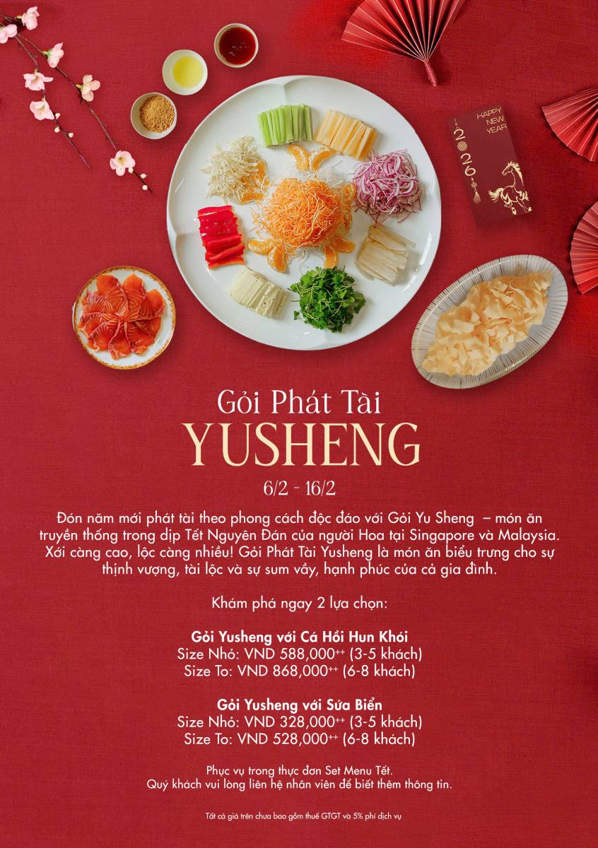 Lấy cảm hứng từ món ăn truyền thống trong dịp Tết Nguyên Đán của người Hoa tại Hồng Kông, Singapore và Malaysia, Gỏi Yu Sheng được các đầu bếp của chúng tôi hòa trộn từ nhiều loại rau củ thái sợi bắt mắt, sứa biển hay cá hồi tươi ngon, kết hợp cùng nước sốt chua ngọt đặc biệt.